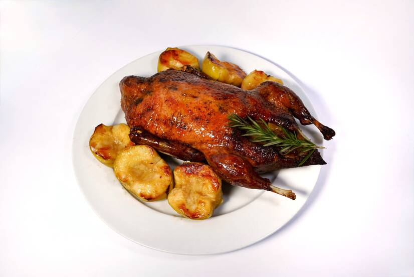 Запечена качка з ароматними яблуками, соковита з хрусткою скоринкою.