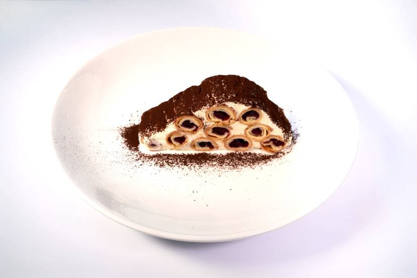 Десерт, що складається з кількох шарів, чергуючі трубочки з вишнею та сметанковим кремом.