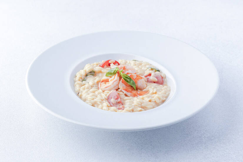 Ніжне орзото з тигровими креветками, у вершковому соусі бiск