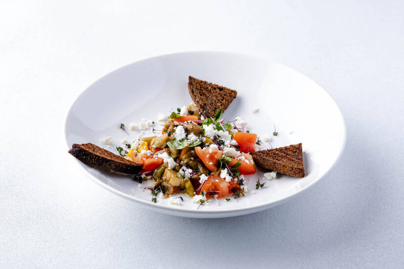 запечені баклажан і болгарський перець, мікадо червоні та жовті, овеча бринза, цибуля червона, базилік, кінза, мікрогрін, заправляється соусом ""вінегрет"", подається з грінками із чорного хліба