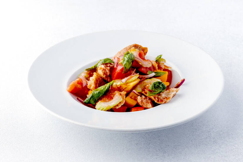 соковиті томати, хрусткий хліб, стебло селери, червона цибуля, оливкова олія, базилік. Заправлений фірмовим соусом