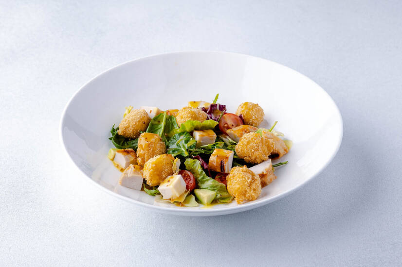 Мікс салатів, помідори чері, авокадо, куряче філе гриль, бейбі моцарела в хрусткій паніровці, заправляється медово-гірчичним соусом
