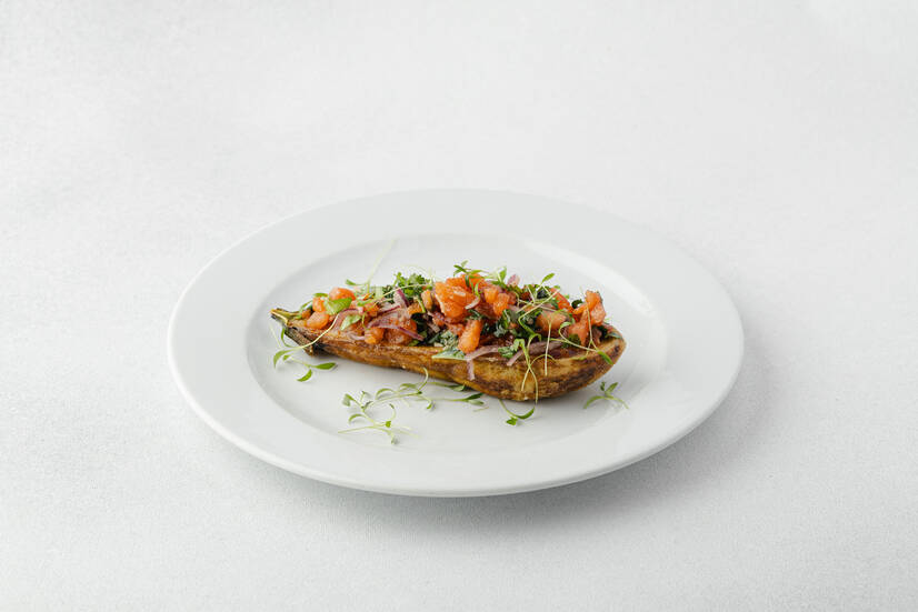 Запечений, під пікантною заправкою з дрібно нарізаних овочів.