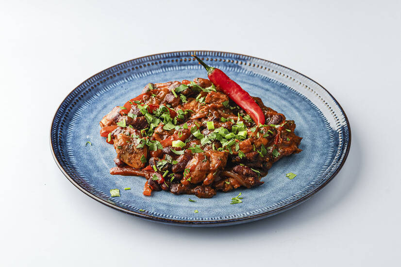 Червона квасоля з куркою та болгарським перцем в насиченому томатному соусі.
