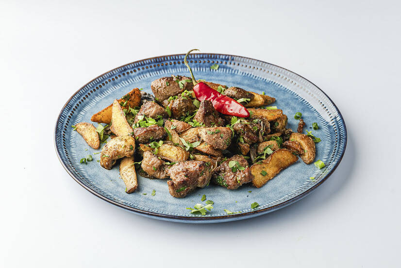 зі свининою, обсмаженою картоплею, цибулею та спеціями.