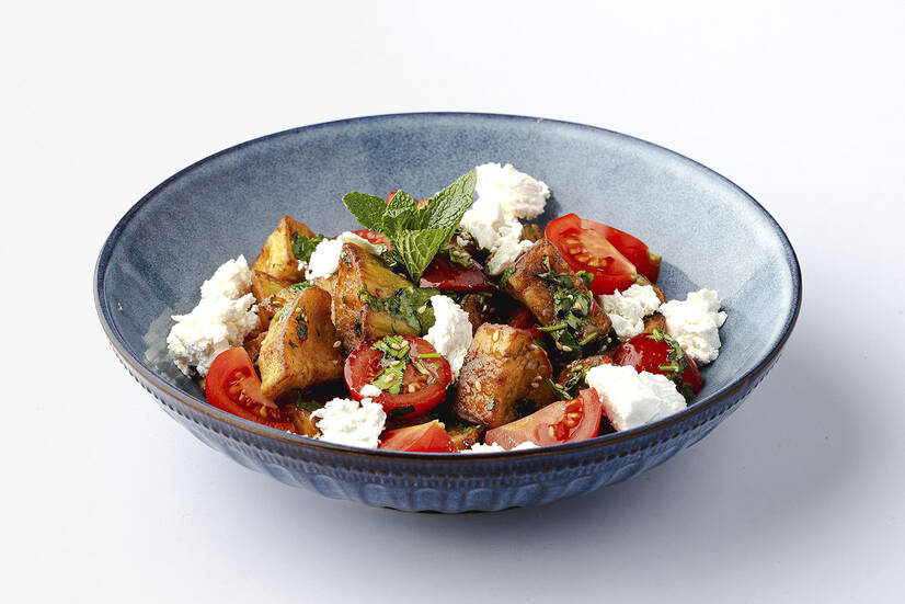 Хрусткий баклажан з чері, фетою, ароматною заправкою та грецьким горіхом.