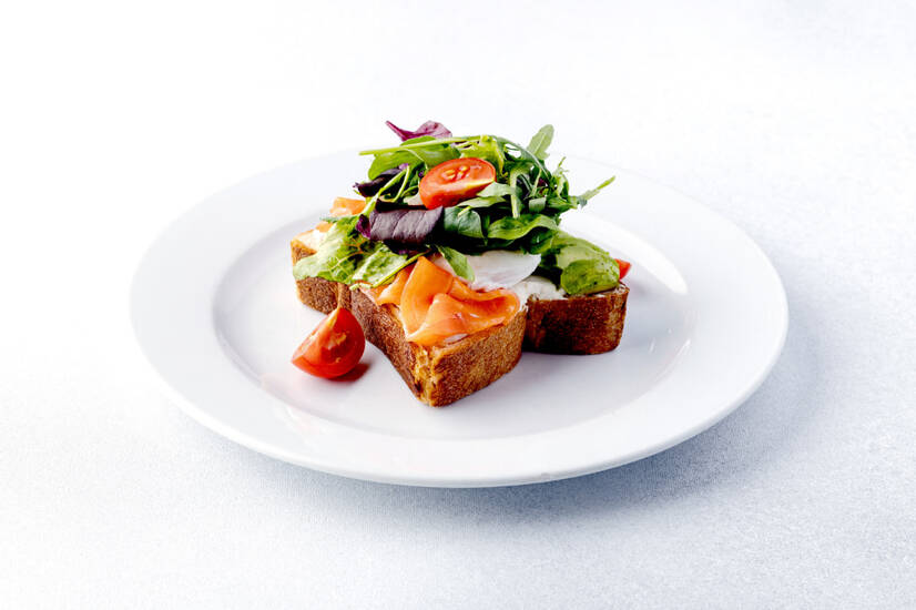 Пишний бріош, авокадо, слабосолений лосось, крем-сир, яйце пашот, зелень